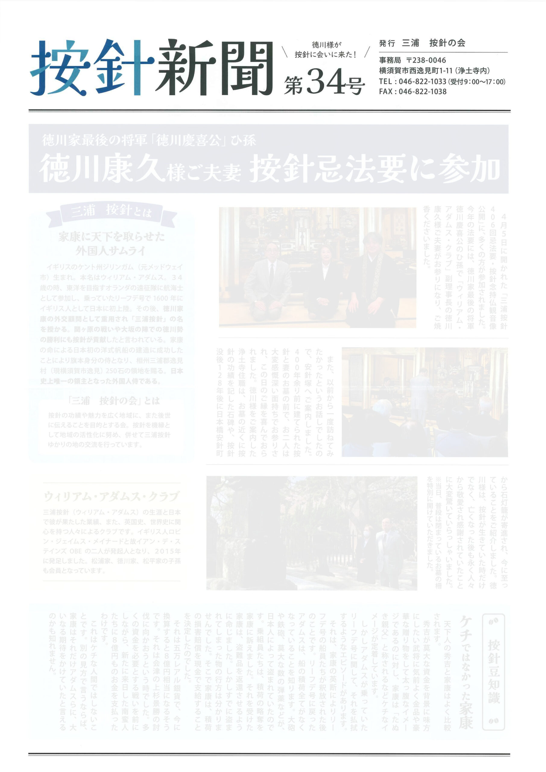 按針新聞は徳川家康に外交顧問として仕えた三浦按針(ウィリアム・アダムス)の菩提(ぼだい)寺の浄土寺が事務局として年2回発行している新聞で、イベントの報告や按針豆知識を掲載しています。